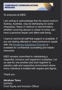 The reluctance to unequivocally call out antisemitism or invoking caveats or broader framing extends beyond political leaders. This week, a source sent me the message distributed by the Chief Equity and Inclusion Officer at ISED in the wake of the Australia massacre. The message references only the “recent event” in Australia with no mention of Jews, Chanukah, or antisemitism. If the message was meant to provide assurance of support, it had the opposite effect, leaving Jewish recipients unseen with the anodyne message.