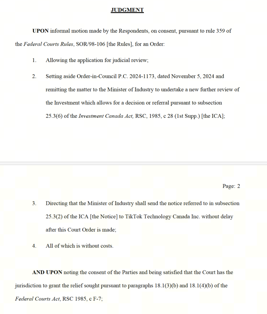 The reset on the TikTok ban came through what amounts to a settlement between the government and TikTok that was made official yesterday by the federal court. TikTok had challenged the government’s ban order as part of a judicial review process. While initial reports suggested that the court had overturned the government’s order banning the company, as the screenshot from the judgment shows, the reality is that the government asked the court to do so as it filed the motion asking that the order be set aside.